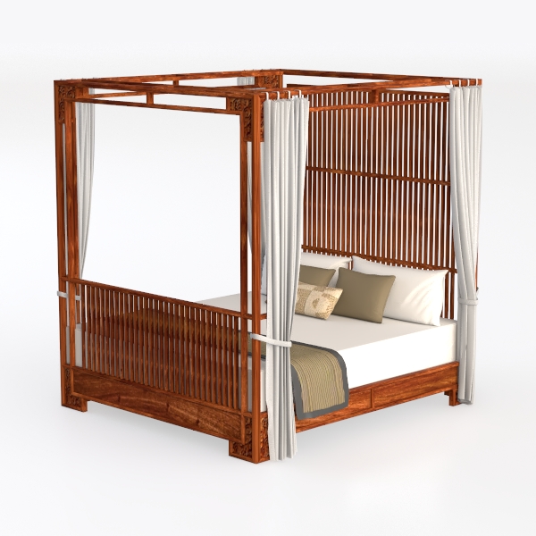 Rooted in traditional craftsmanship, this bed features warm wood grain and smooth curves, creating a cozy, elegant vibe. Sheer curtains add softness, while intricate carvings on the frame enhance its timeless appeal. Ideal for a serene, minimalist Chinese-style bedroom, pairing beautifully with linen bedding and low-profile nightstands. The sturdy frame and generous headboard offer excellent support, ensuring a restful sleep.