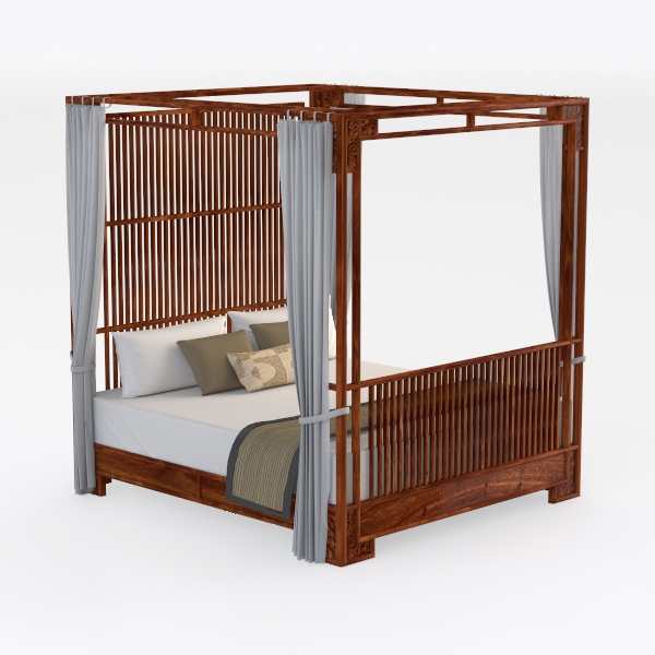 HomeStock Queen Size Canopy Bed - Rustic Wood & Ra