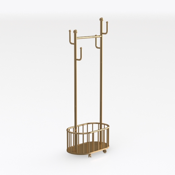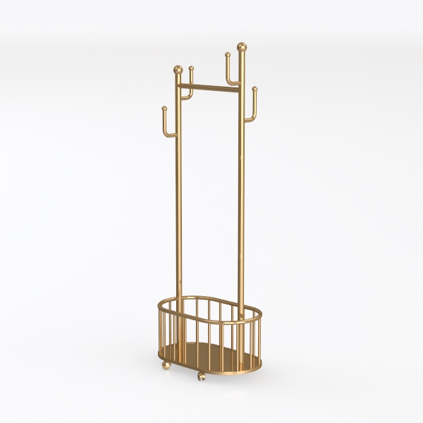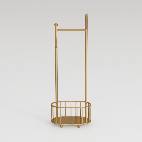 Inspired by mid-century modern minimalism, this elegant gold metal rack blends sleek lines with a polished finish, radiating warmth and sophistication. Its top bar effortlessly holds coats or scarves, while the circular lower shelf offers space for folded sweaters or baskets, perfect for a contemporary living room or bedroom—ideal with marble surfaces and soft linen accents.
