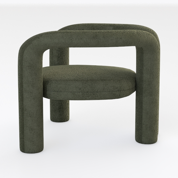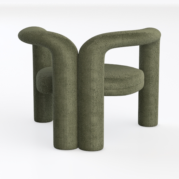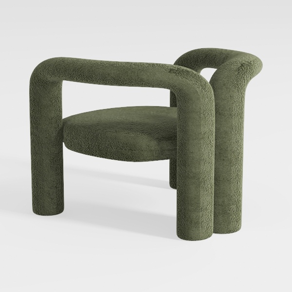 The textured, plush upholstery in a warm sage green hue wraps around the structure, inviting touch with its velvety softness. Light catches the fabric’s subtle pile, casting gentle shadows that enhance the chair’s three-dimensional depth, while the muted green tone exudes a calming, earthy energy that complements diverse color palettes.