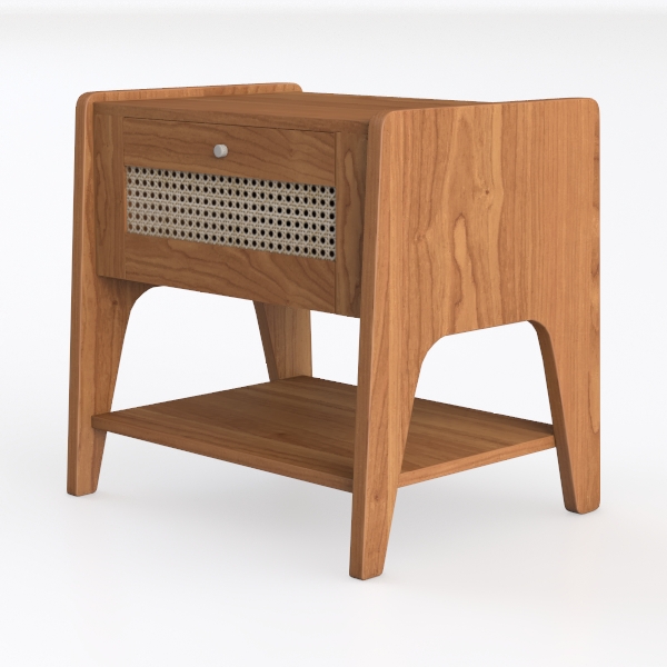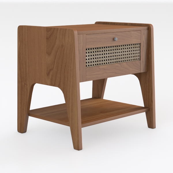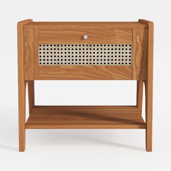 This piece draws inspiration from the timeless synergy of natural materials and modern minimalism, evoking the warmth of handcrafted artistry with a sleek, uncluttered silhouette. Its frame, crafted from light oak, features a smooth, sanded surface that highlights the wood’s rich, natural grain—subtle, warm, and inviting, as if bringing a whisper of the outdoors into the space. The drawer front, a striking contrast, is adorned with a delicate, woven rattan-like texture, adding airy lightness and intricate artisanal detail that softens the overall design. Visually, the warm, earthy tone of the wood creates a calming backdrop, while the open lower shelf below offers a practical, uncluttered surface for small essentials like a reading lamp or a potted succulent.