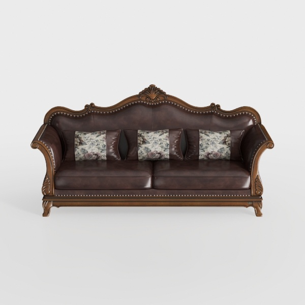 Ornate Leather Sofa Wooden Carved Frame Brown