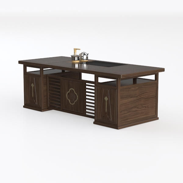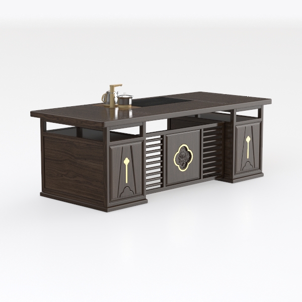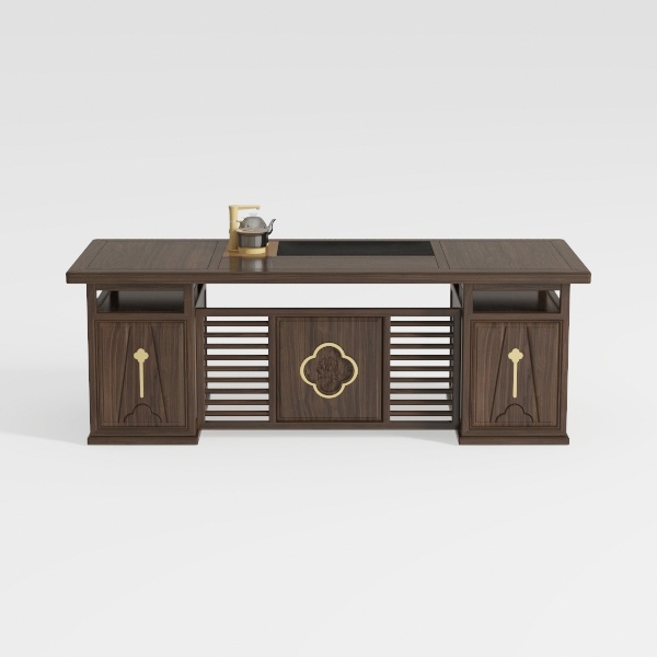 Inspired by traditional Eastern aesthetics, this wooden console blends warm dark wood with gold metal accents, featuring intricate floral patterns and slatted doors. Its smooth, textured surface offers a tactile blend of wood and metal, exuding elegance and calm. Ideal for a Chinese-style tea room or study, it pairs beautifully with teapots and greenery, while ample storage (drawers and cabinets) ensures practical daily use.