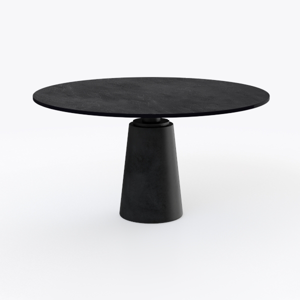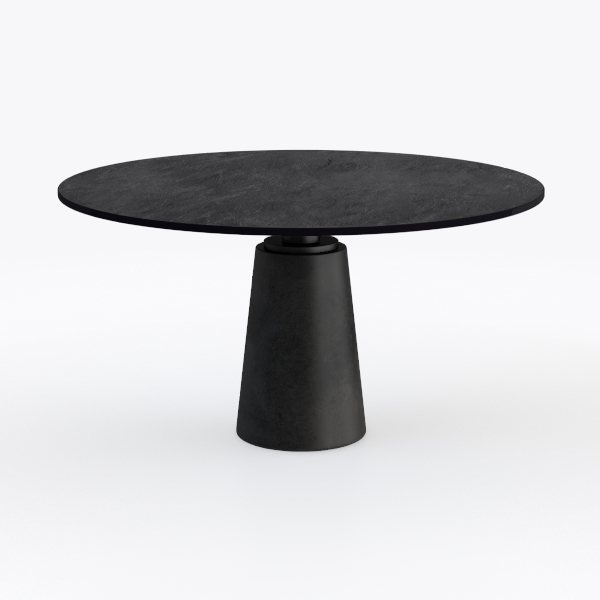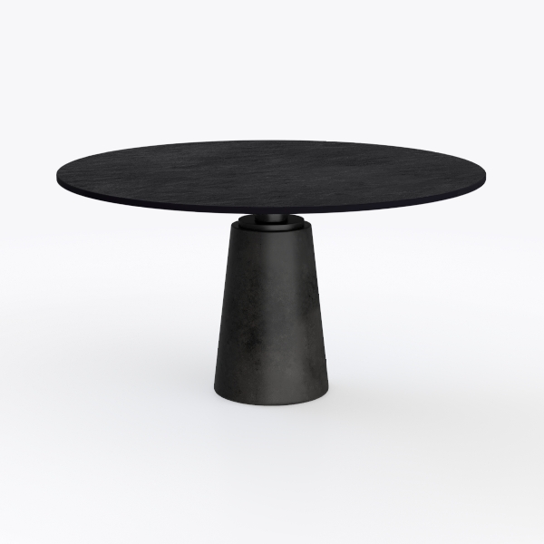 Inspired by architectural minimalism, this table merges clean lines with natural textures. Its matte black top, mimicking polished stone, offers a cool, tactile surface, while the conical base in textured concrete adds subtle weight. Perfect for modern, Scandinavian, or industrial spaces—ideal with metal-legged chairs and potted greenery. Stable and easy to clean, it balances style and practicality for dining, work, or casual gatherings.