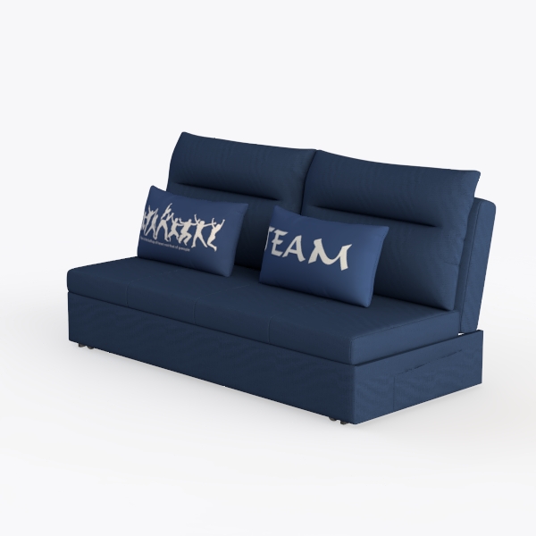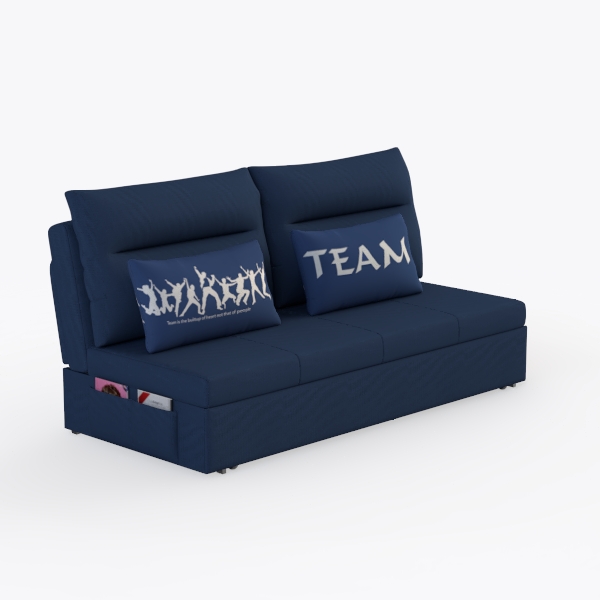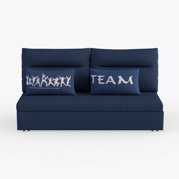 Crafted from a soft, textured fabric in a deep navy hue, the sofa’s surface feels surprisingly robust yet gentle to the touch. The subtle weave catches light softly, creating a warm, inviting glow, while the rich blue tone grounds the space with a sense of calm. The two complementary cushions add character: one features a playful, silhouetted design of figures in motion, infusing a touch of energy and movement, while the other boldly states “TEAM” in crisp white lettering, a cheerful nod to connection and community.