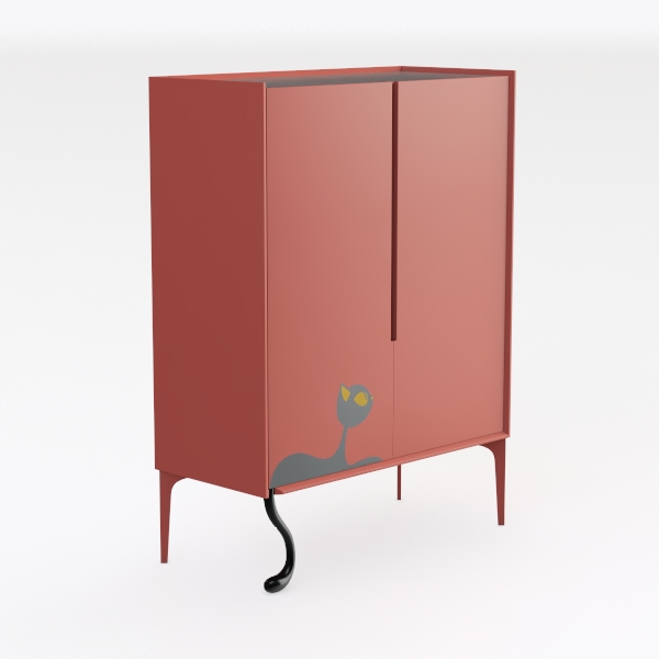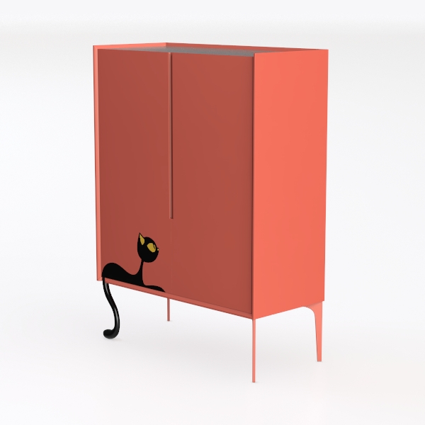 Inspired by playful pet motifs, this cabinet features a smooth, warm coral hue with a matte finish. The curved black cat decal with bright yellow eyes adds a lively, whimsical touch, balancing bold color with soft visual appeal. Ideal for a modern kids' room or cozy living space, it pairs beautifully with wooden shelves and pastel decor. Two spacious doors offer hidden storage, while slender legs keep the piece light and airy, perfect for organizing toys or daily essentials.