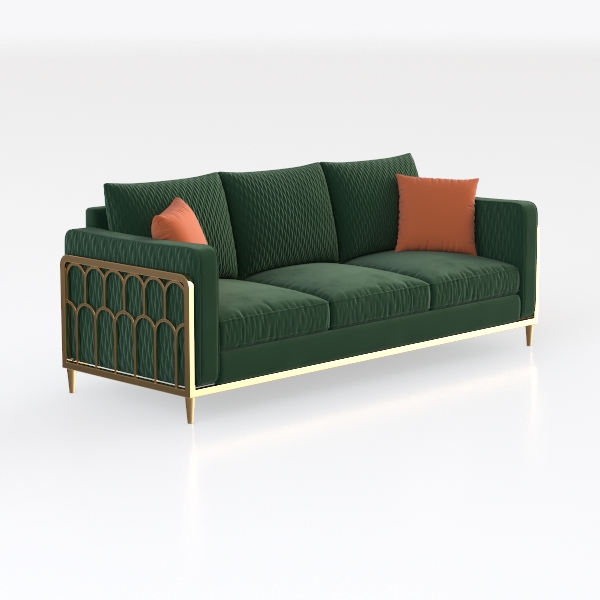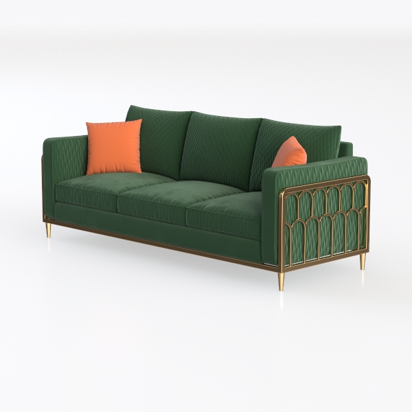 This sofa blends mid-century modern warmth with contemporary sophistication, drawing inspiration from nature’s rich hues and architectural simplicity. Its lush emerald upholstery, with a soft, subtle waffle texture, feels incredibly inviting to the touch—velvety yet breathable, it catches light gently to add depth without overwhelming the eye. The slim, gold-toned metal frame, with its sleek, angular legs, brings a touch of understated luxury, balancing the sofa’s plushness with a sense of lightness. Two vibrant tangerine throw pillows nestle neatly on the seats, adding a lively contrast that elevates the overall aesthetic.