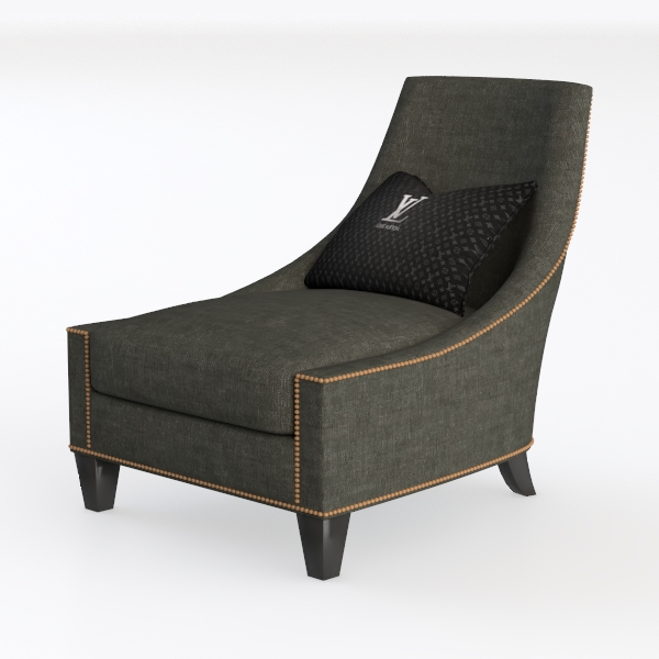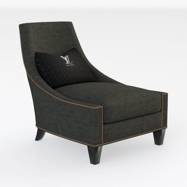 This elegant armchair blends timeless craftsmanship with modern simplicity, drawing inspiration from mid-century modern design reimagined for today’s spaces. Its deep charcoal upholstery, crafted from a textured linen-cotton blend, feels soft yet structured—gentle to the touch, with a subtle weave that catches light softly. Warm brass nailhead trim traces the armrests and base, adding refined detail without overwhelming, while a plush black lumbar pillow with a subtle LV monogram rests on the high, sloped back, balancing boldness with understated luxury.