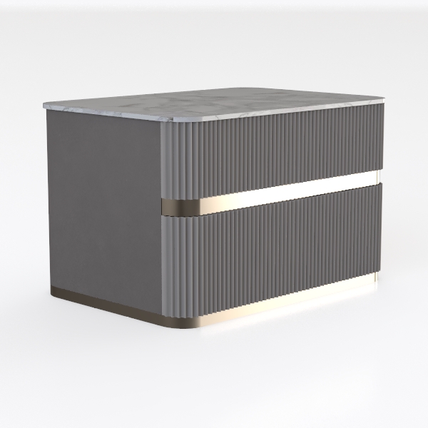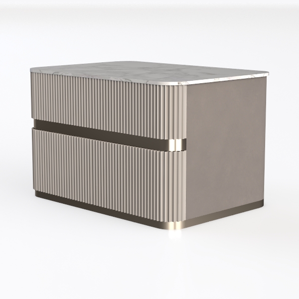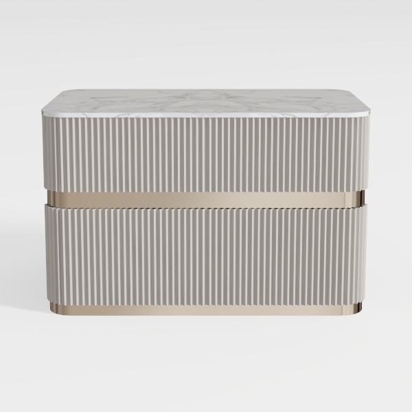Inspired by architectural minimalism, this side table blends a smooth marble top with subtle vertical texture on its frame. Sleek metallic bands add a touch of luxury, creating a clean, sophisticated look. Ideal for a modern minimalist living room, pair it with a velvet sofa and geometric rug. Its two-tiered design offers practical storage, balancing style and functionality seamlessly.