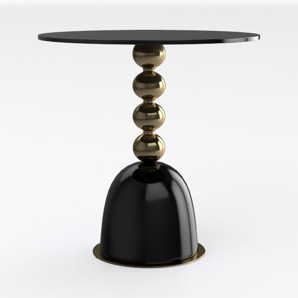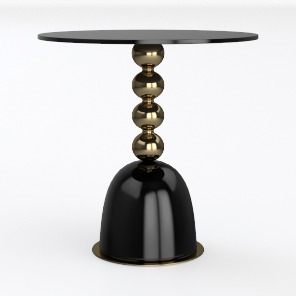 Inspired by mid-century modern design, blending geometric precision with warm metallic accents. Glossy black tabletop contrasts with polished gold spherical supports, their reflective surfaces catching light, while the bell-shaped black base adds soft, sculptural depth. Ideal for a modern-luxe living room, pairing beautifully with marble surfaces and brass lighting, with a stable base ensuring balance and a spacious top for essentials.