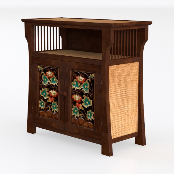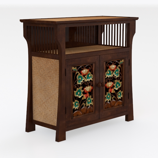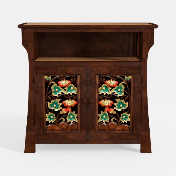 Inspired by nature's vibrant blooms, this wooden cabinet showcases intricate floral carvings in teal, red, and gold, contrasting beautifully with its deep, warm wood grain. Its sturdy frame and smooth texture offer a tactile, inviting feel, ideal for a cozy, vintage or bohemian-style living room. The enclosed storage behind the doors keeps essentials organized, while the open top shelf adds a charming display space for decor.