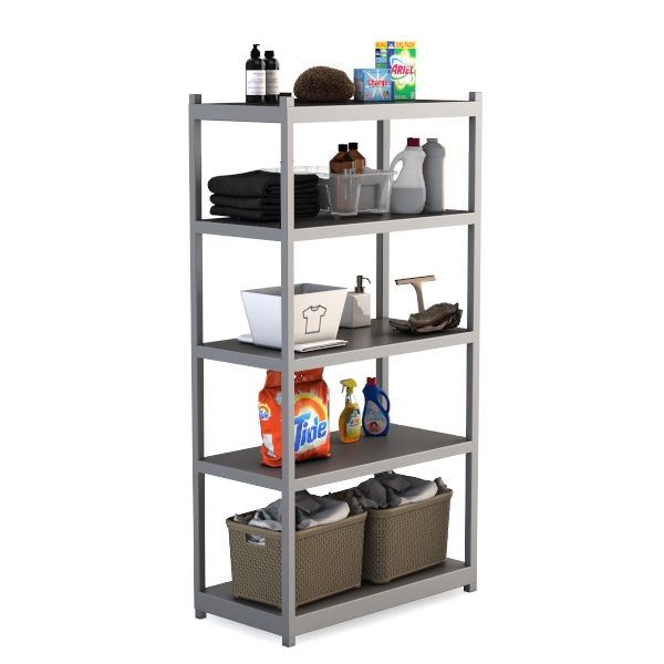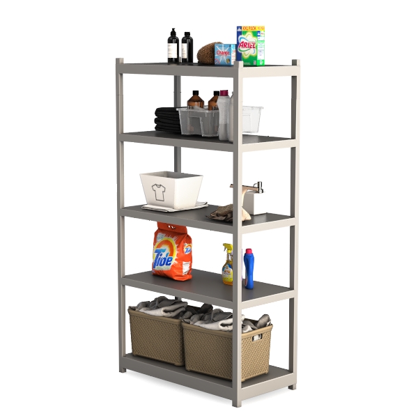 Inspired by daily organization needs, this gray utility shelf features a sleek matte frame with smooth surfaces, blending minimalist design into home spaces. Its open shelves and woven baskets offer ample storage for detergents, linens, and essentials, keeping your laundry area tidy and functional. Perfect for modern utility rooms, it pairs well with wooden accents and soft lighting, enhancing both practicality and aesthetic appeal.