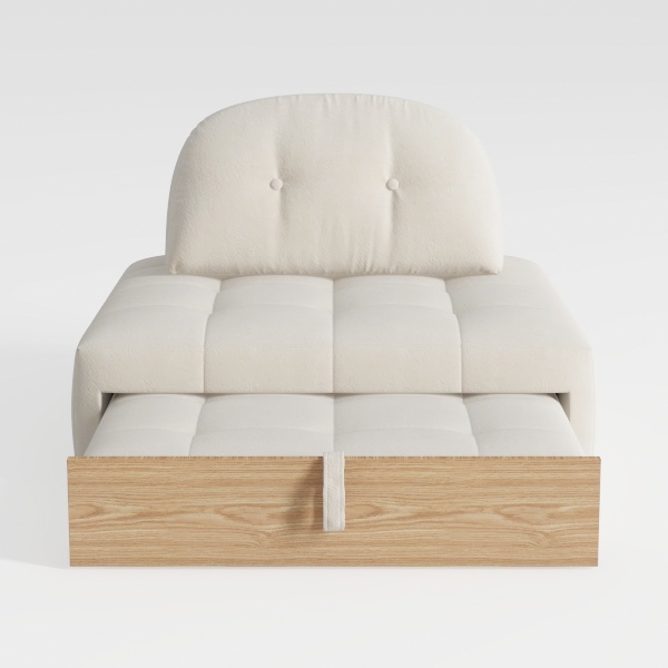 Crafted with a blend of soft, textured upholstery and warm wooden elements, this piece draws inspiration from the quiet harmony of natural textures and the uncluttered simplicity of modern design. The neutral, creamy-white upholstery feels plush and inviting to the touch, with subtle tufting on the gently curved headboard adding a touch of understated elegance—neither overly ornate nor plain, it balances softness with structure. Its low-profile silhouette, paired with a smooth, light oak wooden frame, creates a sense of calm and spaciousness, making it a versatile fit for various bedroom aesthetics.