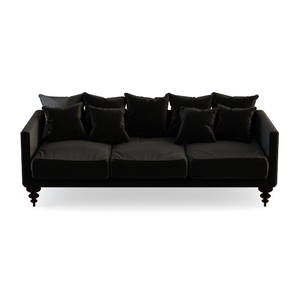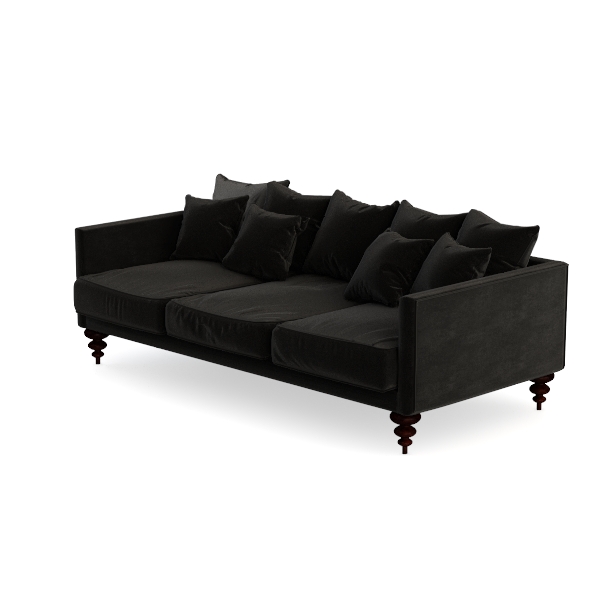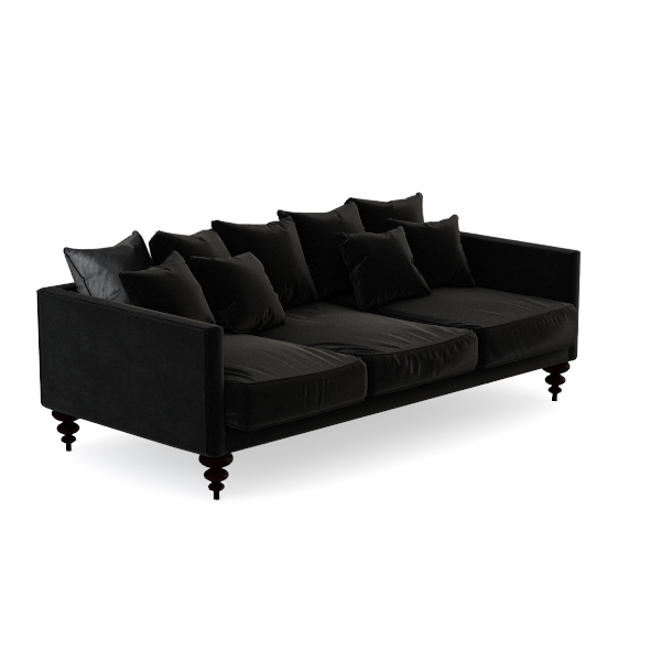 This elegant sofa embodies a harmonious blend of classic and modern aesthetics, drawing inspiration from mid-century design principles reimagined for contemporary living. Crafted with a soft, velvety black fabric, its surface invites a comforting touch—plush yet not overly bulky, wrapping you in gentle support. The rich texture contrasts beautifully with the warm, turned wooden legs: sturdy and subtly ornate, they add a vintage-inspired charm that balances the sofa’s sleek silhouette.