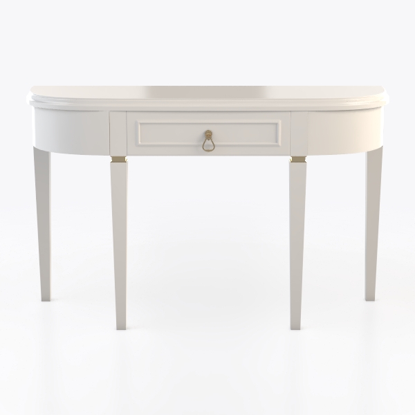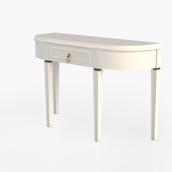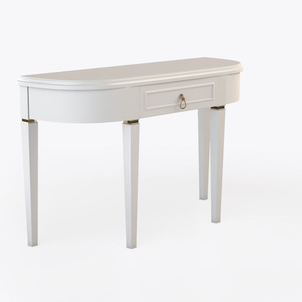 Inspired by classic French provincial design, blending timeless elegance with modern simplicity, this half-moon side table features a sleek, matte white surface that contrasts beautifully with polished gold metal accents. Its slender, tapering legs add a light, airy feel, while a single, smoothly gliding drawer offers practical storage for small essentials. Ideal for a cozy living room or bedroom, it pairs seamlessly with marble-top coffee tables and vintage-inspired wall art to enhance a soft, sophisticated ambiance.