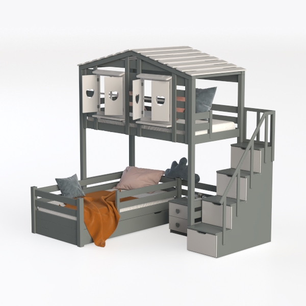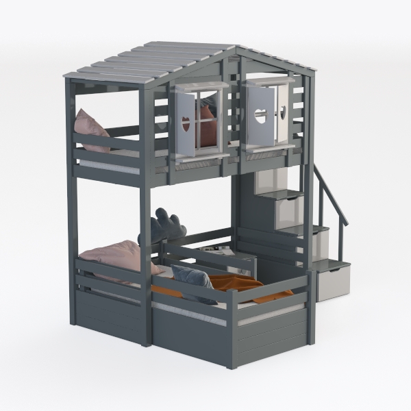 Inspired by fairy tale charm, this kids' bed features a house-shaped upper deck with heart-windowed sides, blending warm, natural textures. The lower bed, paired with a cloud decor and an orange throw, creates a cozy, whimsical vibe. Perfect for a playful children's room, it includes integrated storage drawers under the staircase and a spacious lower bed for rest.