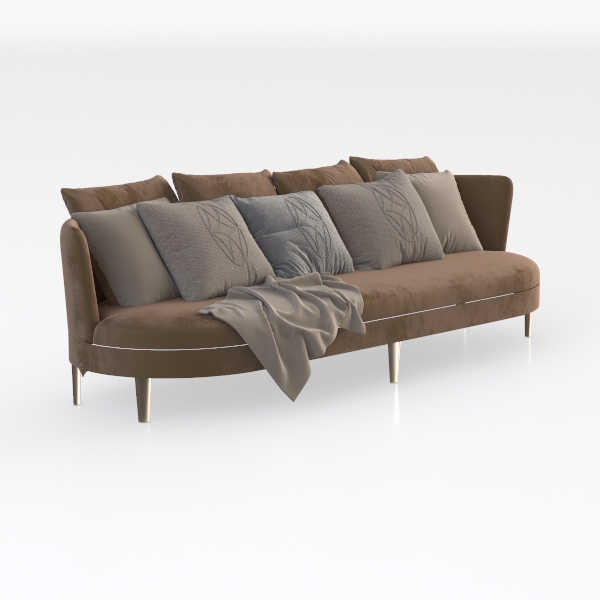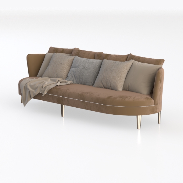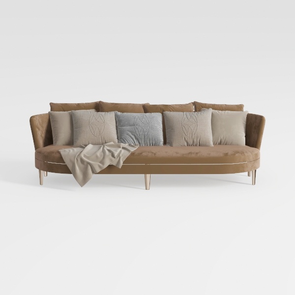 This sofa draws inspiration from the fluid, organic curves of natural elements—think smooth seashells or cloud-like softness—blending a touch of mid-century warmth with modern minimalism to create a piece that feels both nostalgic and fresh. Its velvety caramel-brown upholstery wraps around a gently curved frame, offering immediate tactile comfort: soft to the touch, with a subtle sheen that catches light without overwhelming, and a texture that’s rich yet inviting, like resting on a well-loved, high-quality blanket. The visual allure lies in its balanced simplicity: the curved silhouette softens the room’s edges, while the sleek, silver-tone metal legs add a refined, lightweight contrast, keeping the design from feeling heavy.