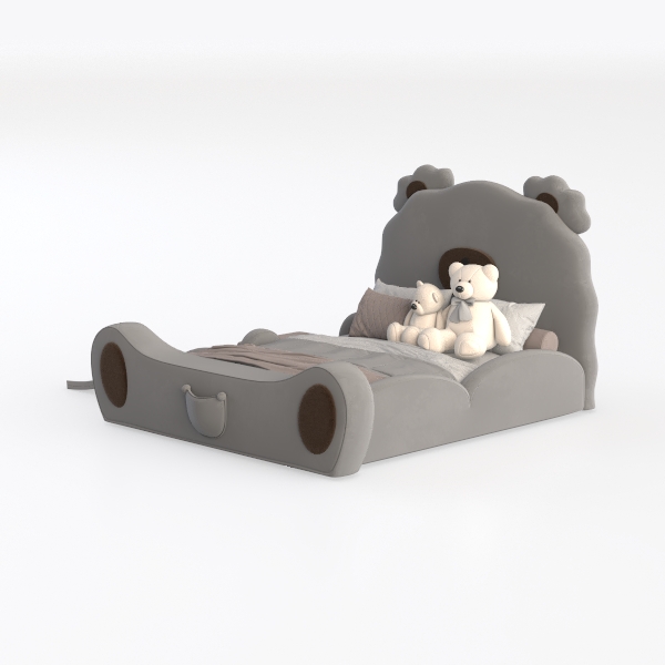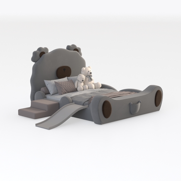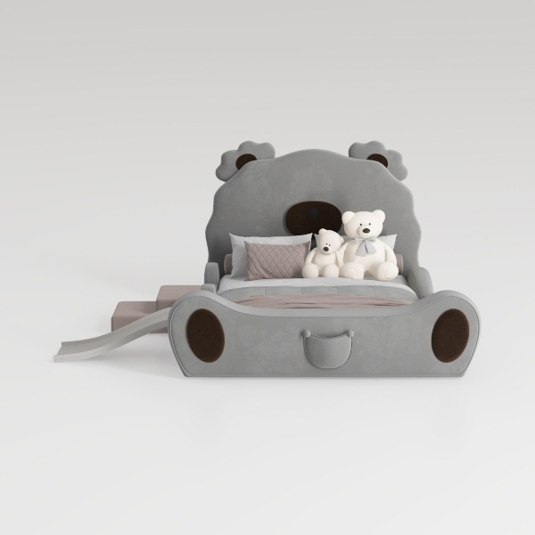 Inspired by playful animal designs, this cozy bed features soft, velvety gray fabric that feels warm to the touch. Its bear-shaped headboard and curved frame create a whimsical vibe, ideal for a kids' room. A built-in slide adds interactive fun, making bedtime exciting, while pastel accents and plush toys enhance its charming, playful aesthetic.