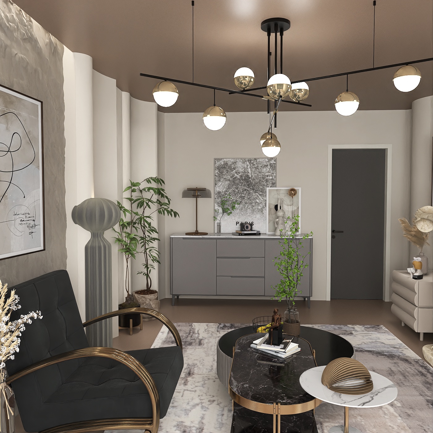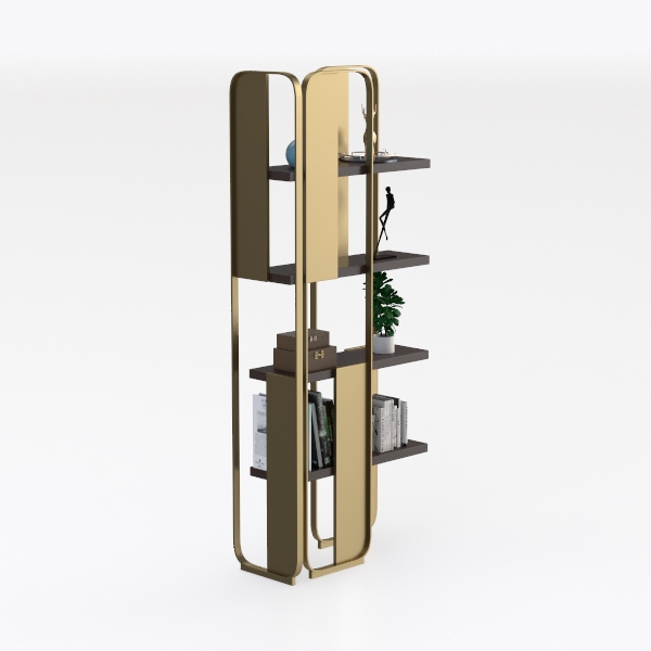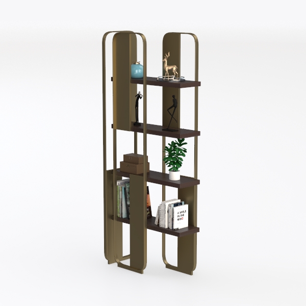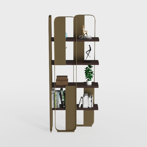 Designed with organic architectural lines, this shelving unit blends geometric precision with warm wooden tones. The matte gold metal frame and rich walnut shelves create a sleek, inviting contrast, with smooth surfaces catching light subtly. Ideal for modern-luxe living rooms or home offices, pair with marble accents and metallic decor. Generous, staggered shelves offer ample storage for books, plants, and art, balancing style and utility seamlessly.