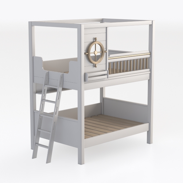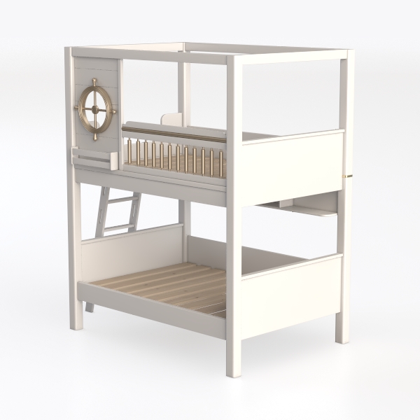 Inspired by nautical adventures, this double bed features a crisp white frame contrasting warm wooden slats, accented by a golden ship wheel. Its fresh, playful vibe suits a child’s room with ocean-themed decor, where the sliding board adds fun and guardrails ensure safety, maximizing space with two levels.