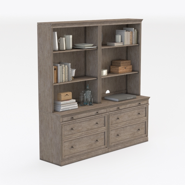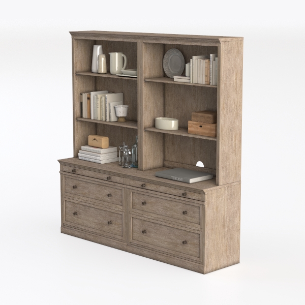 Inspired by natural textures and vintage warmth, this wooden cabinet features weathered wood with a smooth touch and light, earthy tone. Symmetrical shelves and drawers blend storage and display, ideal for a cozy living room or study, pairing with neutral sofas and vintage lighting to enhance the space’s inviting charm.