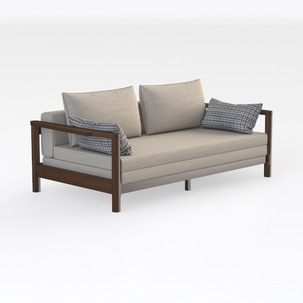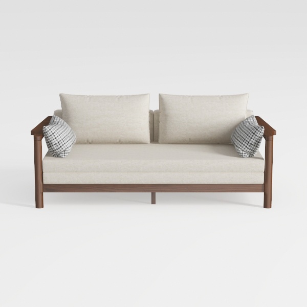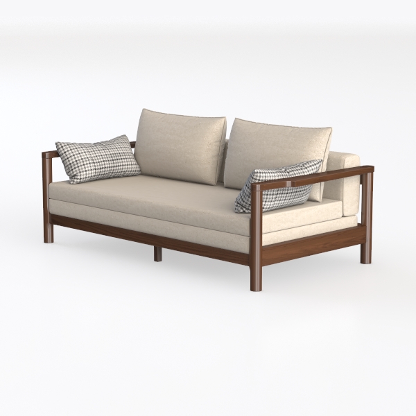 Inspired by the quiet charm of natural materials and the clean lines of minimalist design, this sofa marries organic warmth with modern practicality. Its soft, neutral upholstery—likely a breathable linen-cotton blend—feels gently textured to the touch, with plump, well-padded cushions that cradle the body in relaxed comfort. Contrasting its light, airy fabric, the frame is crafted from rich, grainy wood, its warm brown hue and visible wood grain adding a grounded, earthy depth that balances the sofa’s softness. The overall silhouette is uncluttered, with sleek, tapered armrests and a low-profile design that feels both contemporary and timeless, casting a calm, inviting glow in any space.