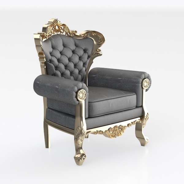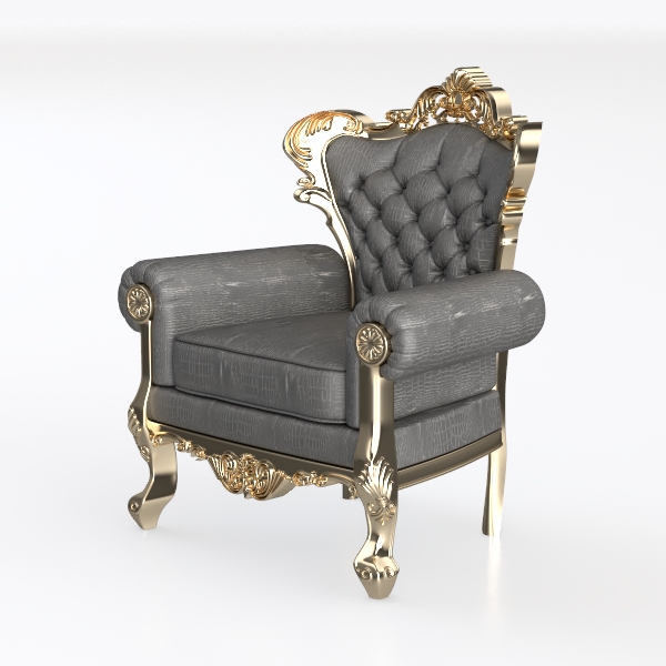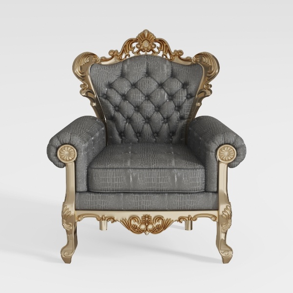 This elegant armchair draws inspiration from the opulent craftsmanship of Baroque and Rococo design, blending timeless classical aesthetics with a modern touch. Its frame, crafted from polished gold-toned metal, features intricate, hand-carved floral motifs and scrolling details, adding depth and a sense of grandeur to its silhouette. The seat and backrest are upholstered in a textured gray fabric, mimicking the subtle, lifelike pattern of crocodile skin—soft to the touch yet with a refined, tactile appeal that elevates the chair’s visual and physical presence.