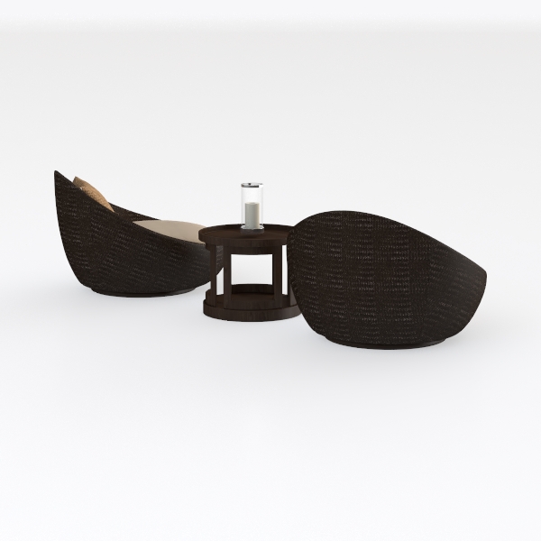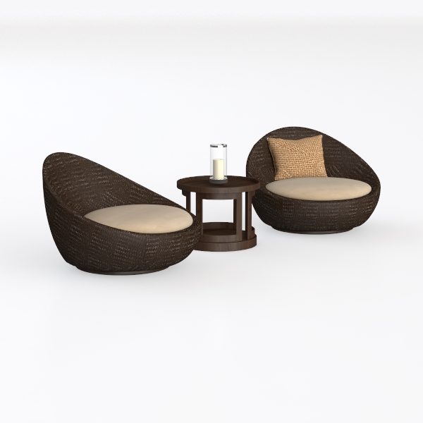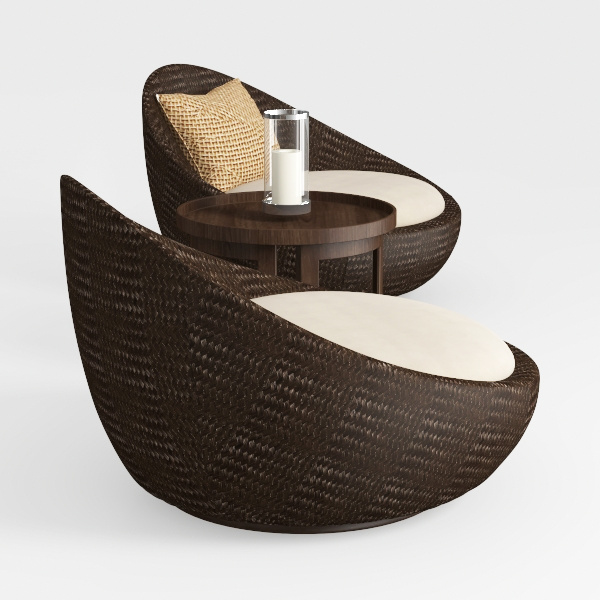 This set of two lounge chairs and a round side table embodies a blend of natural inspiration and modern elegance. Evoking the fluid curves of seashells or smooth river stones, the design feels organic and serene, with soft, rounded edges that invite relaxation. The deep brown woven texture of the chairs boasts a subtle handcrafted quality, each strand creating a rhythmic pattern that catches light gently, while the plush cream upholstery of the seats offers a warm, inviting contrast. Visually, the furniture feels light yet substantial—its undulating silhouette softens any space, making it ideal for creating a calm, cozy atmosphere.