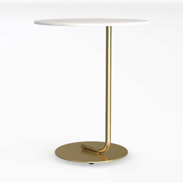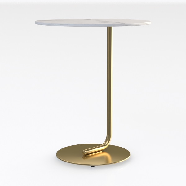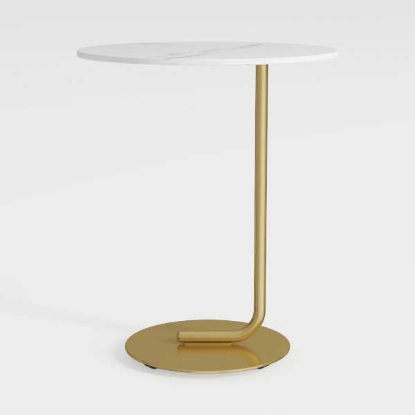 Inspired by the blend of natural stone and sleek metal, this piece merges organic texture with geometric precision. The smooth, veined white top contrasts softly with the warm gold metal base, creating a bright, airy look that feels both elegant and modern. Perfect for a modern minimalist living room, it pairs beautifully with plush sofas and marble coffee tables, adding subtle luxury. A sturdy, curved metal leg and weighted base ensure stability, while its compact size suits side tables or nightstands.
