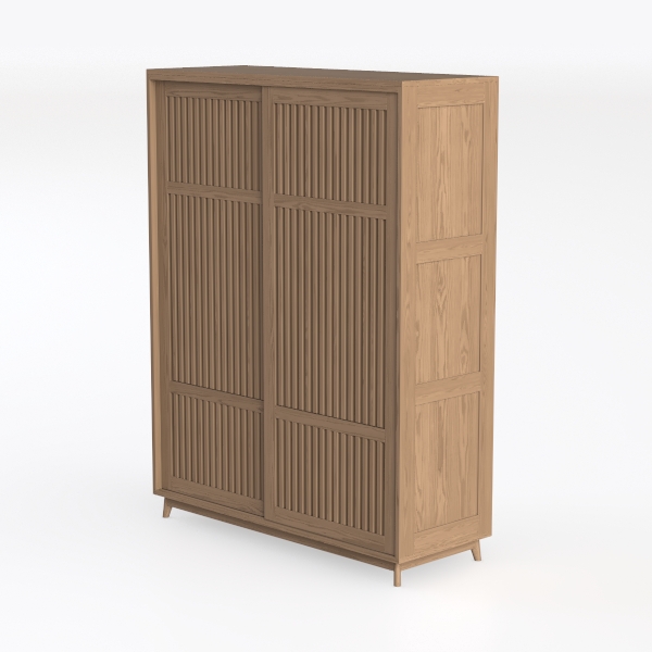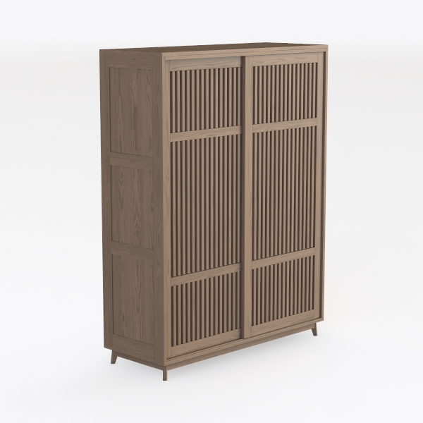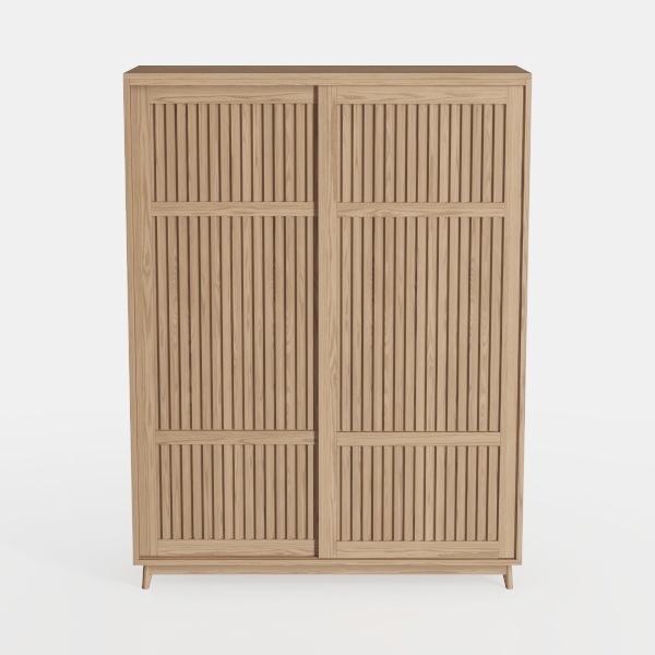 Crafted with natural elements, its design draws from minimalist Scandinavian aesthetics, blending warm wood tones with clean lines. The smooth oak-like surface reveals subtle grain patterns, offering tactile warmth that softens the space. Vertical slatted doors create a light, airy silhouette, avoiding bulk while adding texture. Ideal for a serene bedroom or compact wardrobe, it pairs beautifully with linen bedding and potted greenery. Spacious double doors and slim, tapered legs maximize storage without overwhelming the room, balancing utility and style.