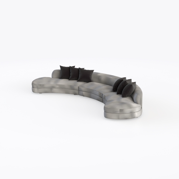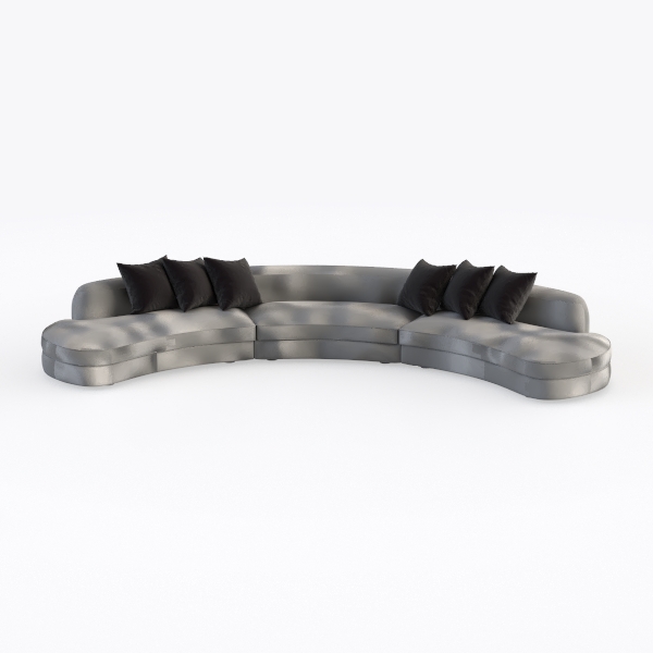 Visually, the upholstery shimmers subtly under soft light, with a smooth, buttery texture that invites touch. The muted gray hue is versatile yet striking, acting as a calm backdrop that highlights the sofa’s fluid lines, while the three pairs of plump black cushions add contrast and depth, their plush fabric promising a cozy sink-in experience.
