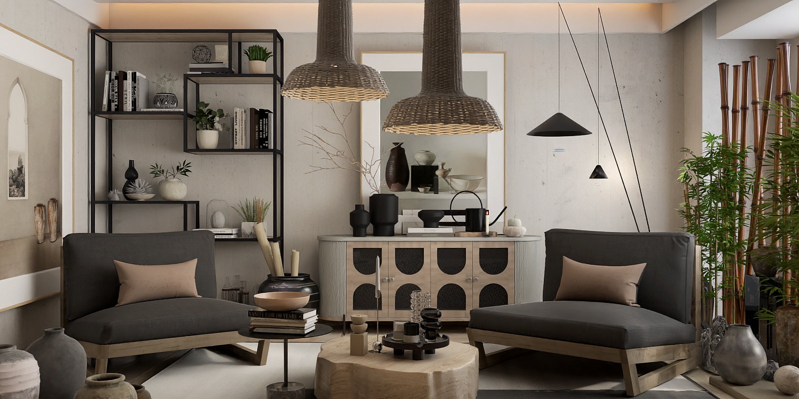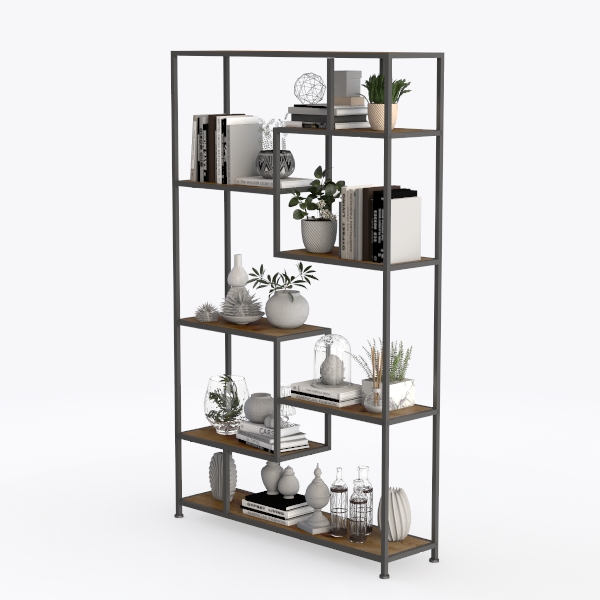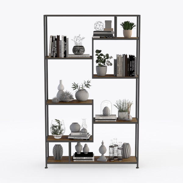 Blending natural warmth with industrial edge, this open shelving unit features a sleek metal frame and soft wooden shelves. The cool, structured metal contrasts with the textured wood, while crisp monochrome tones and layered greenery/ceramics create a clean, airy vibe. Ideal for modern minimal or Scandinavian living rooms/studies, pairing with marble accents and metallic decor. Multiple tiers offer space for books, plants, and decor, balancing storage and display.
