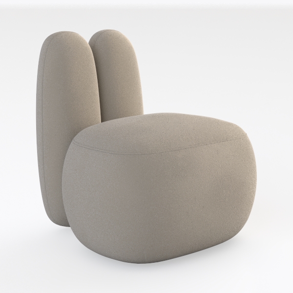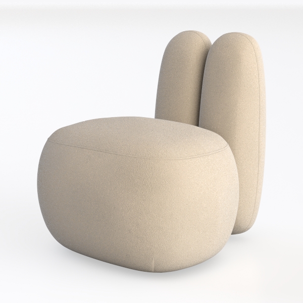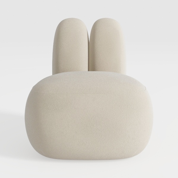 The chair features a soft, rounded silhouette that blends playful charm with serene elegance. Its design draws inspiration from nature’s gentle curves, particularly the soft, rounded forms of small creatures, creating a piece that feels both whimsical and grounded. Crafted with a smooth, light beige upholstery, the surface has a tactile richness—plush to the touch, like sinking into a cloud, with a subtle texture that catches light softly, avoiding harsh reflections for a warm, inviting glow. The backrest, shaped like two gently tapering "ears," adds a touch of whimsy, while the wide, low-profile seat offers a generous, hug-like embrace, making it ideal for both casual lounging and extended relaxation.