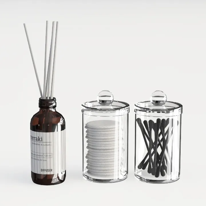 A 3D model of a bathroom accessories set, featuring a brown glass diffuser with white label, two transparent glass jars holding cotton pads and swabs. It has a minimalist, modern aesthetic, low polygon count, and is ideal for bathroom organization and display.