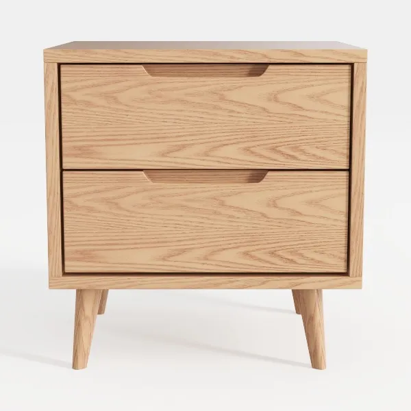 Crafted with Scandinavian minimalism in mind, this piece blends organic warmth with understated elegance. Its smooth, light oak surface showcases rich, natural wood grain, inviting gentle tactile interaction. Perfect for a serene Scandinavian or mid-century modern bedroom, pair it with linen bed linens and soft lighting. Two spacious drawers offer ample storage for bedtime essentials, balancing style and practicality seamlessly.