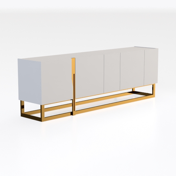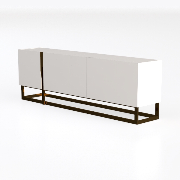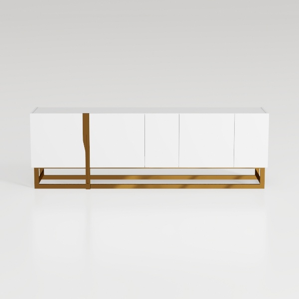 Designed with modern minimalism, blending clean geometric lines and classic metallic accents for timeless allure. Sleek white cabinet fronts, smooth to touch, contrast beautifully with polished gold metal frame, creating a bright, airy look. Ideal for modern-luxury living rooms, pairs with marble coffee tables and brass lamps, balancing simplicity and sophistication. Ample storage behind soft-closing doors, sturdy base ensures stability, a striking functional focal point.