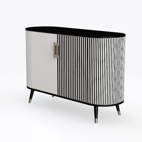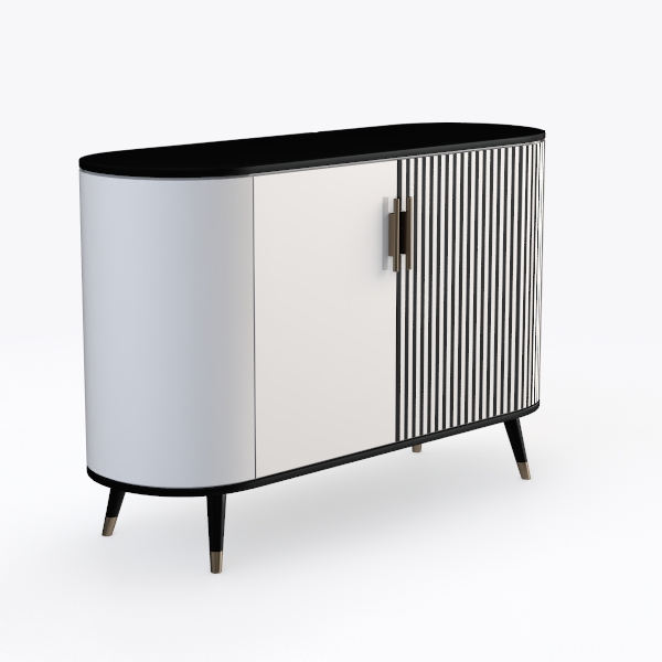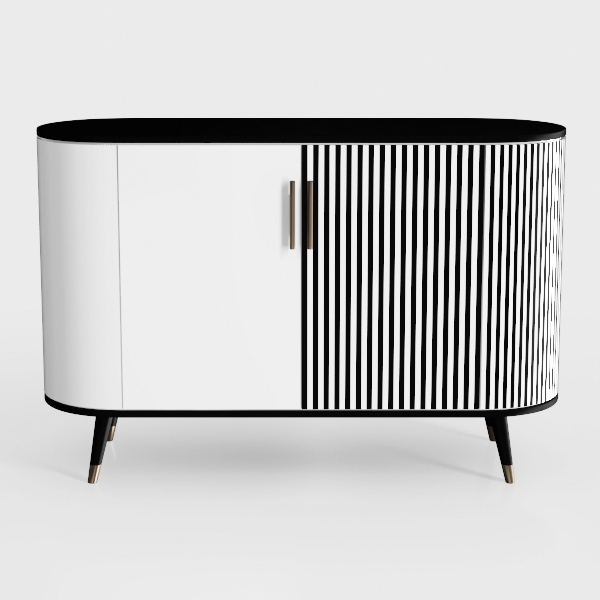 Inspired by bold geometric art and minimalist design, this cabinet blends sharp lines with soft curves. Sleek, matte surfaces and contrasting black-and-white stripes create a striking visual rhythm, while slender metallic legs add lightness to its sturdy frame. Perfect for modern minimalist or Scandinavian-inspired living rooms, it pairs beautifully with wooden floors and neutral-toned decor. Ample storage space behind smooth doors, with easy-to-clean surfaces and stable, elevated legs for uncluttered charm.