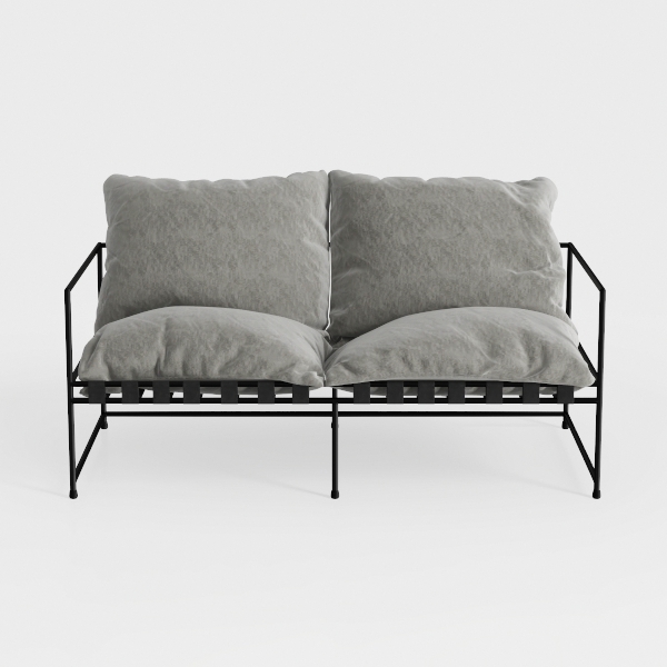 The sofa’s visual appeal lies in its muted, warm gray upholstery—plush and velvety to the touch, the fabric feels surprisingly lightweight, as if floating gently atop the frame. The two generously sized cushions, filled with a blend of down and foam, offer a cloud-like softness that invites relaxation, while their subtle texture adds depth without overwhelming the eye. Below, a slender black metal frame, with its delicate geometric patterns and matte finish, provides a striking contrast to the upholstery, creating a sense of lightness and airiness in the space.