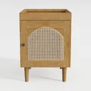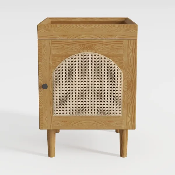 Inspired by natural craftsmanship, this wooden cabinet features warm oak tones, smooth wood surface, and intricate rattan weaves, blending softness and texture. Ideal for a minimalist or bohemian bedroom, it pairs well with linen bedding and potted plants. A single door hides storage space, while slender legs enhance its light, airy feel.