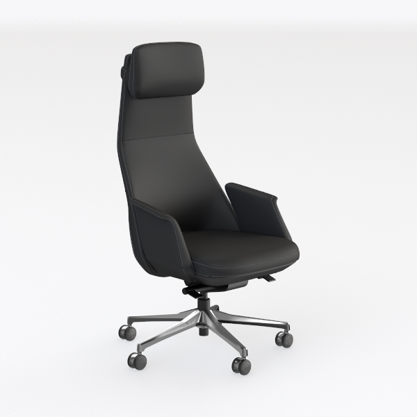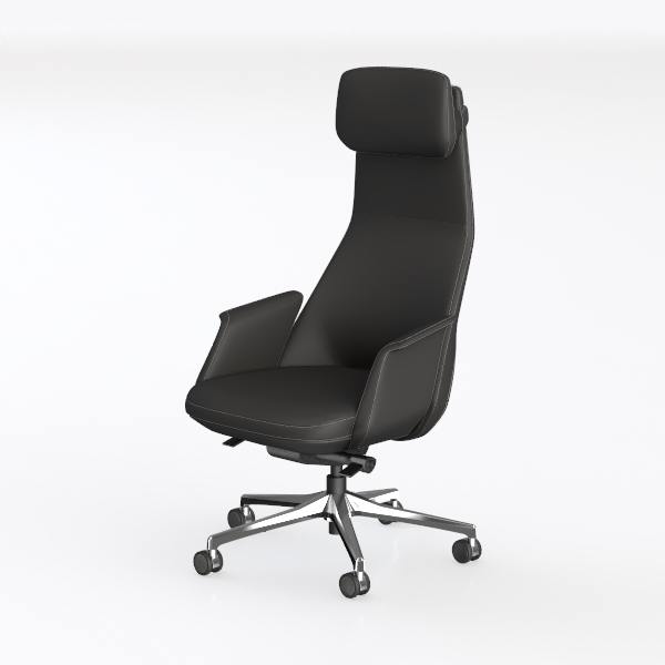 Inspired by minimalist design and ergonomic principles, this sleek black leather chair features clean lines and a high back. Its smooth, cool-to-the-touch surface contrasts with a sturdy metal base, offering full lumbar support and smooth-rolling casters. Perfect for a modern home office or workspace, pair it with wooden desks and metallic accents for a polished look.