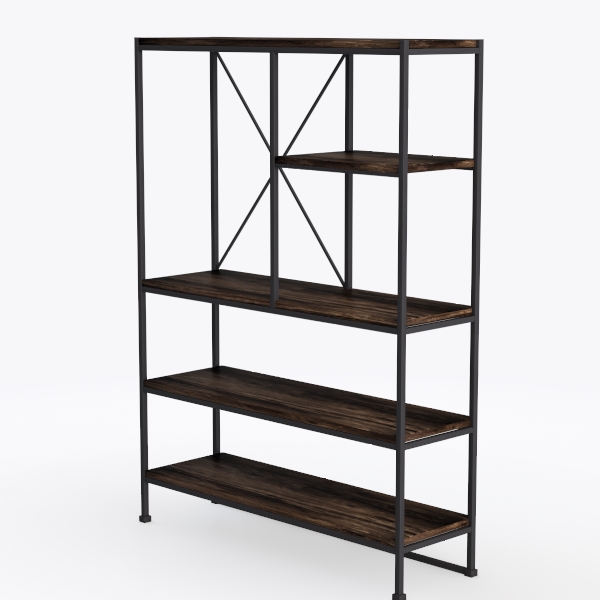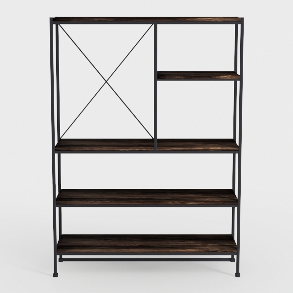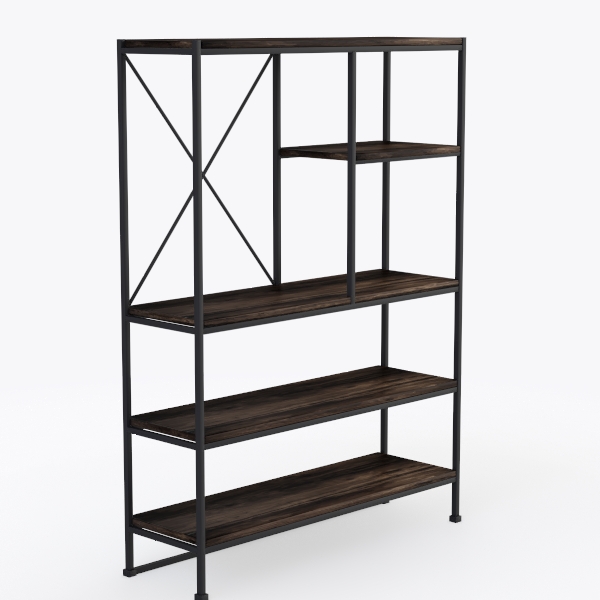 Inspired by industrial and mid-century modern fusion, this shelving unit blends warm, rustic wood grains with sleek matte black metal, creating a tactile mix of coziness and edge. Perfect for a loft-style living room or home office, it pairs seamlessly with leather sofas and vintage decor. Spacious, staggered shelves accommodate books, plants, and collectibles, balancing display space with practical storage.