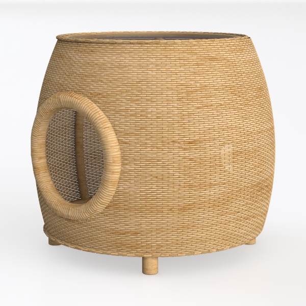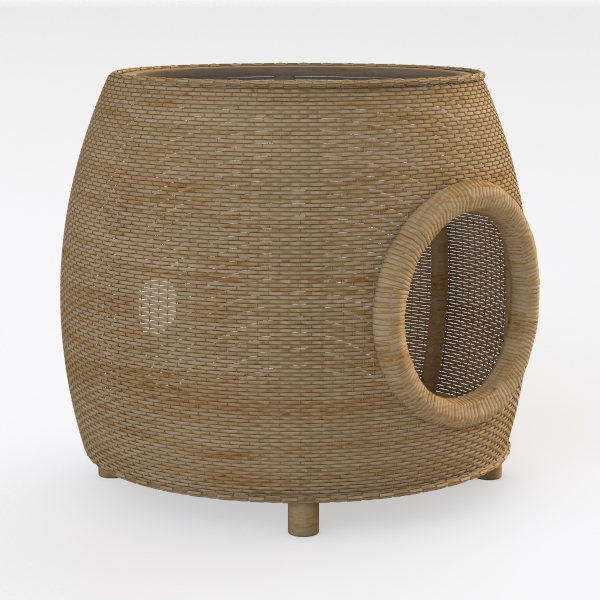 Inspired by natural weaving traditions, this woven home piece has a warm, textured surface with a soft, organic feel. Its light, airy design blends seamlessly into minimalist, bohemian, or Scandinavian spaces, complementing wooden floors and potted plants. The circular opening adds a playful touch, offering a cozy, enclosed interior—ideal for small pets or as a functional side table.
