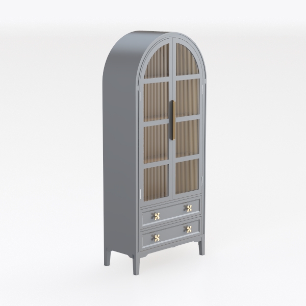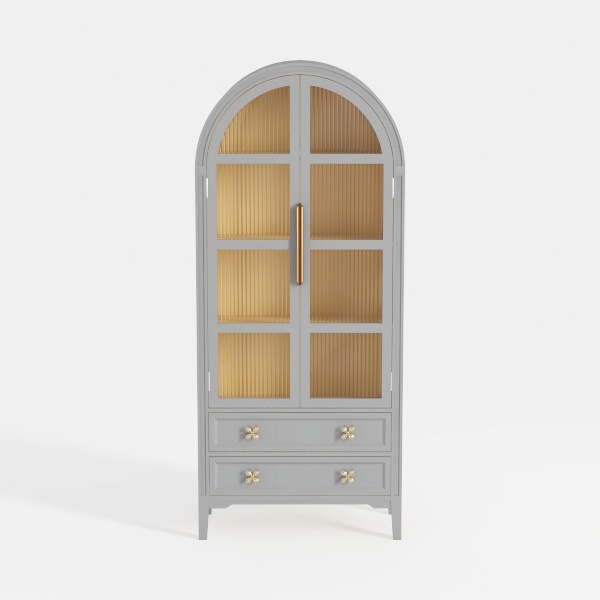 This elegant display cabinet draws inspiration from classic architectural arches, blending timeless charm with modern simplicity. Its smooth matte gray finish contrasts beautifully with delicate ribbed glass, while gold metal handles and cross-shaped drawer pulls add subtle luxury. Perfect for a living room or dining space, it elevates modern minimalist or mid-century modern interiors when paired with marble side tables and metallic accents. Tall and slender, it features glass doors to showcase cherished items and two drawers for practical hidden storage, balancing aesthetics and utility.
