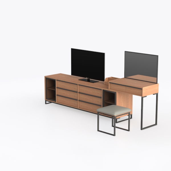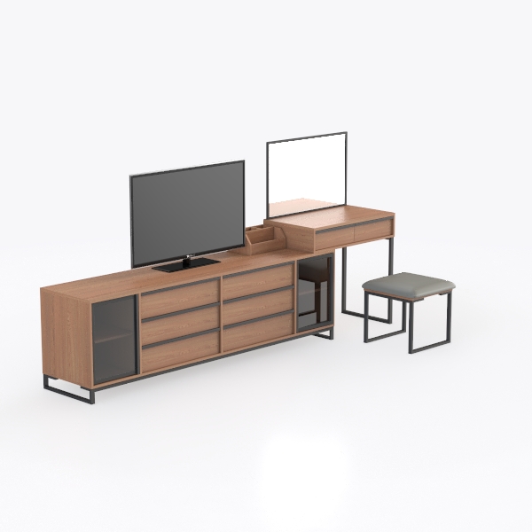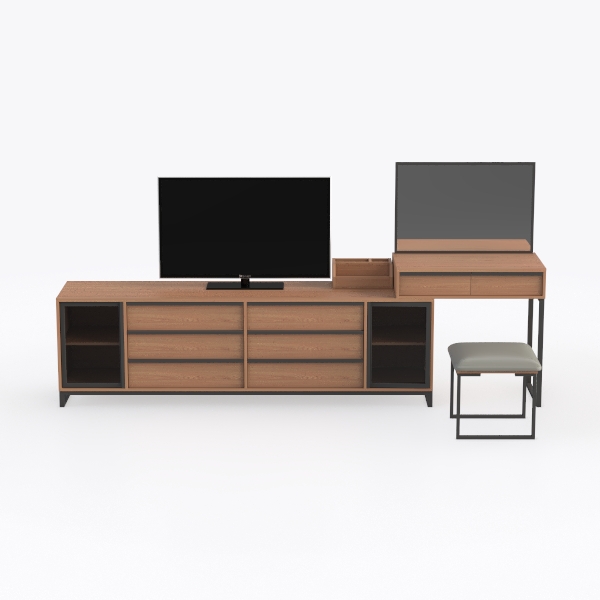 Inspired by minimalist design, blending warm wood tones with sleek metal accents, this furniture set features smooth, matte surfaces. The rich, tactile wood offers a cozy feel, while polished metal edges add a modern crispness, creating a balanced, uncluttered look. Ideal for a contemporary living room or bedroom, it pairs with neutral rugs and soft lighting, with spacious drawers, open shelves, and a compact stool for ample storage and style.