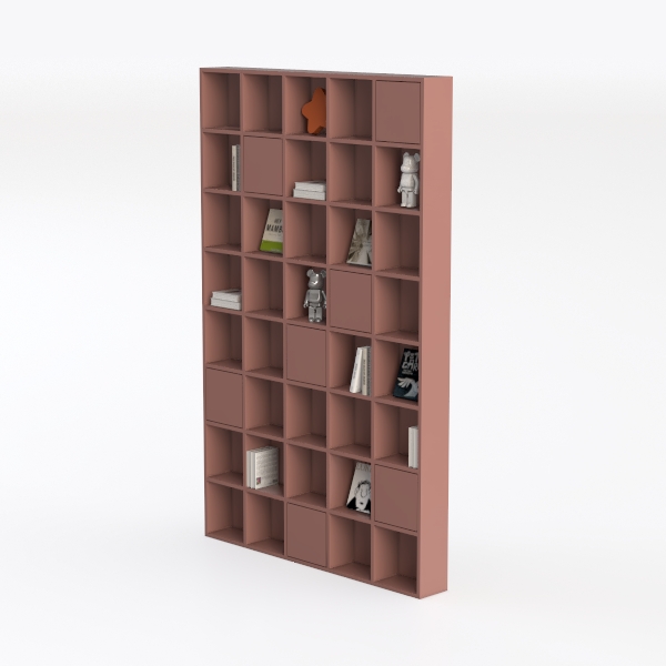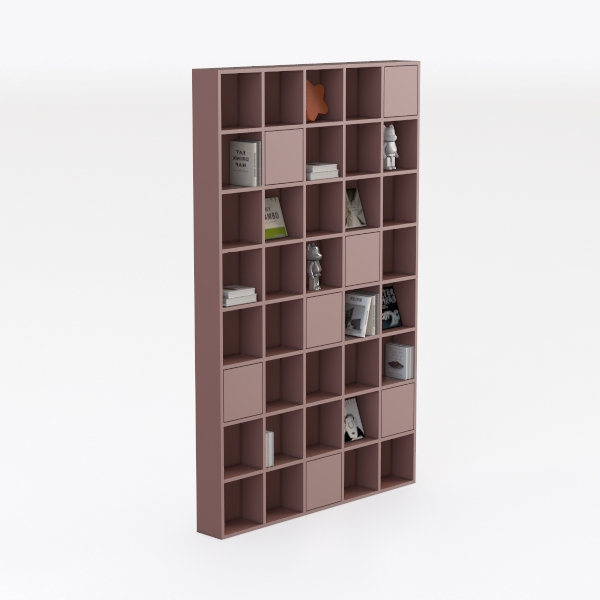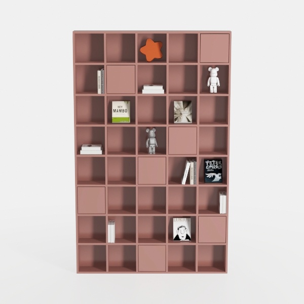 Inspired by geometric symmetry and warm minimalism, this pink grid bookshelf has a soft blush hue, smooth matte finish, and clean, ordered compartments, offering warm tactile charm. It works in modern, Scandinavian, or warm contemporary spaces—perfect for a cozy living room or sleek home office, paired with marble or wooden accents. Versatile compartments in varying sizes hold books, decor, and personal items, balancing functionality with aesthetic appeal.