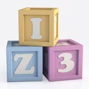 A 3D model of colorful alphabet and number building blocks, featuring soft, child-safe plastic, vibrant colors, and educational letters/numbers. It has detailed clean edges, a playful, colorful aesthetic, suitable for toddler play, educational activities, or decorative display.