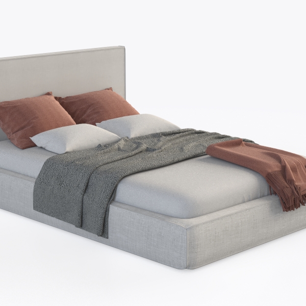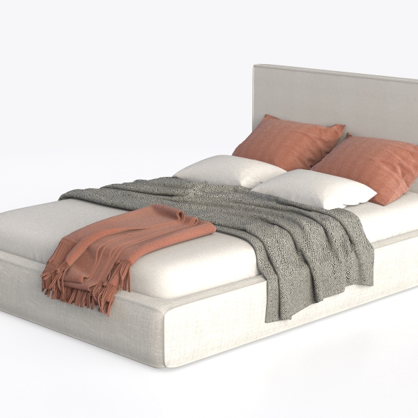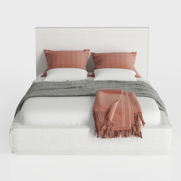 Inspired by minimalist Scandinavian design, this bed features soft, textured linen-like fabric in a light, airy white base. Warm terracotta pillows and a fringed throw add subtle color contrast, while the low-profile frame ensures an uncluttered, open feel. Perfect for a serene master bedroom, it pairs with natural wood nightstands and soft lighting, offering plush, supportive comfort for relaxing evenings.