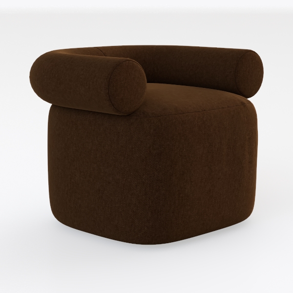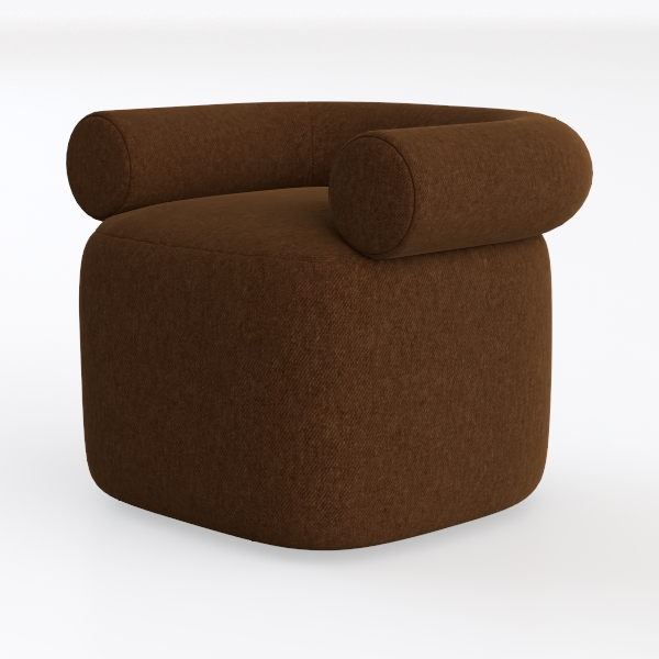 This armchair draws design inspiration from organic, sculptural forms—think smoothed river stones or the gentle curves of a well-worn armrest, blending softness with intentional structure. Its warm, earthy brown upholstery catches the light subtly, with a textured, slightly fuzzy fabric that feels rich and inviting to the touch; sinking into its seat is like resting on a cloud of woven comfort, thick enough to cradle you yet firm enough to maintain its shape. Visually, it balances modern minimalism with organic warmth: a square, stable base supports a rounded back and generously sized, cylindrical armrests, creating a silhouette that feels both contemporary and inherently cozy, like a gentle embrace for the body.