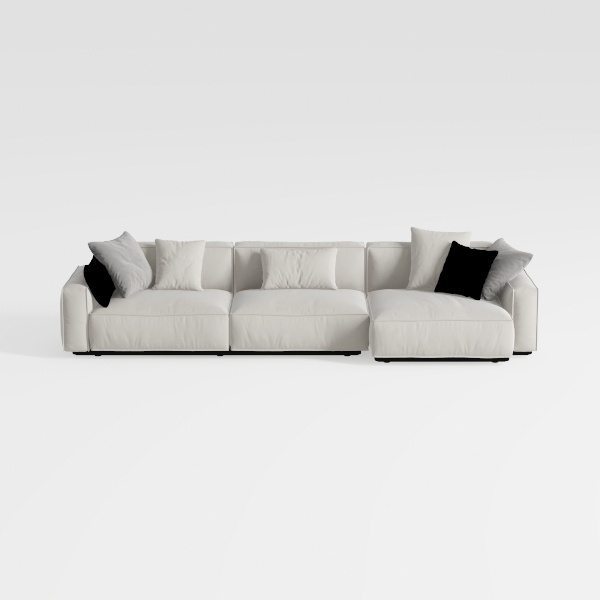 Taking cues from Scandinavian design principles, this sofa blends minimalist elegance with everyday comfort. Its soft, textured white upholstery feels surprisingly warm to the touch, with a subtle sheen that catches light gently, while the low, wide profile—anchored by slim black metal legs—creates a streamlined silhouette that feels both airy and grounded. The L-shaped layout offers generous seating, with deep, generously padded cushions that cradle the body, making it perfect for lazy afternoons or lively gatherings.