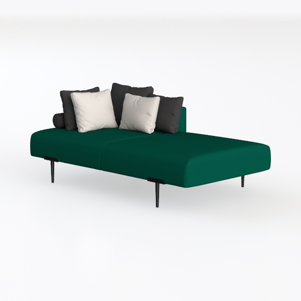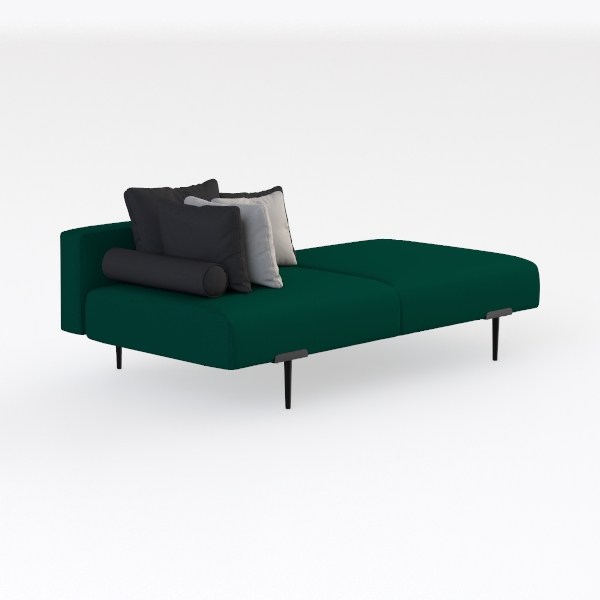 The upholstery, a soft, textured fabric, invites touch with its smooth yet substantial feel, while the rich emerald green hue catches the light subtly, adding depth without overwhelming. Complemented by carefully curated pillows—including a bright white square and plush charcoal-gray rounds—the composition balances contrast and harmony, enhancing the sofa’s visual appeal. Its slim, matte-black legs elevate the design, lending a light, airy presence that makes the piece feel weightless, even in cozy corners.